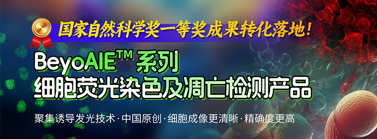 碧云天获得唐本忠教授的相关许可,将此技术应用到细胞分析与检测产品的研发中,并成功推出BeyoAIE™细胞膜红色荧光染色试剂盒、BeyoAIE™细胞核绿色荧光染色试剂盒、BeyoAIE™ Nuclear Green细胞周期与细胞凋亡检测试剂盒、BeyoAIE™死细胞绿色荧光染色试剂盒等四款试剂盒产品。