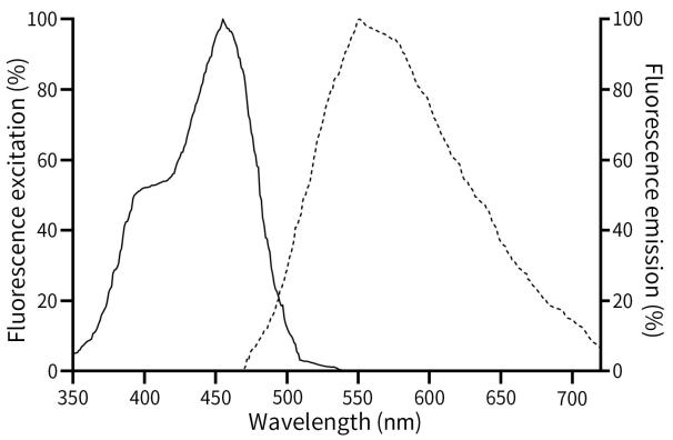 BeyoAIE™ Nuclear Green Probe是一种新型的非细胞膜通透性的细胞核荧光探针,不能穿过具有生物活性的细胞质膜,但可穿过死细胞膜的无序区域而到达细胞核,并嵌入细胞的DNA双螺旋,从而产生明亮的绿色荧光,最大激发波长为455nm,最大发射波长为551nm,发射光谱如图1。
