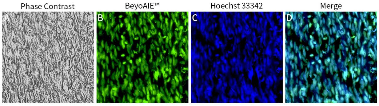 图3.碧云天BeyoAIE™细胞核绿色荧光染色试剂盒(C2105)染色大鼠坐骨神经冰冻切片细胞核的效果图。图A为大鼠坐骨神经在明场下的形态图;图B的绿色荧光为BeyoAIE™ Nuclear Green Probe染色的细胞核;图C的蓝色荧光为Hoechst 33342染色的细胞核。