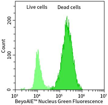 BeyoAIE™ Nuclear Green Probe是一种新型的双链DNA的荧光染料。BeyoAIE™ Nuclear Green Probe和双链DNA结合后可以产生荧光,并且荧光强度和双链DNA的含量成正比。细胞内的DNA被BeyoAIE™ Nuclear Green Probe染色后,可以用流式细胞仪对细胞进行DNA含量测定,然后根据DNA含量的分布情况,可以进行细胞周期和细胞凋亡分析。