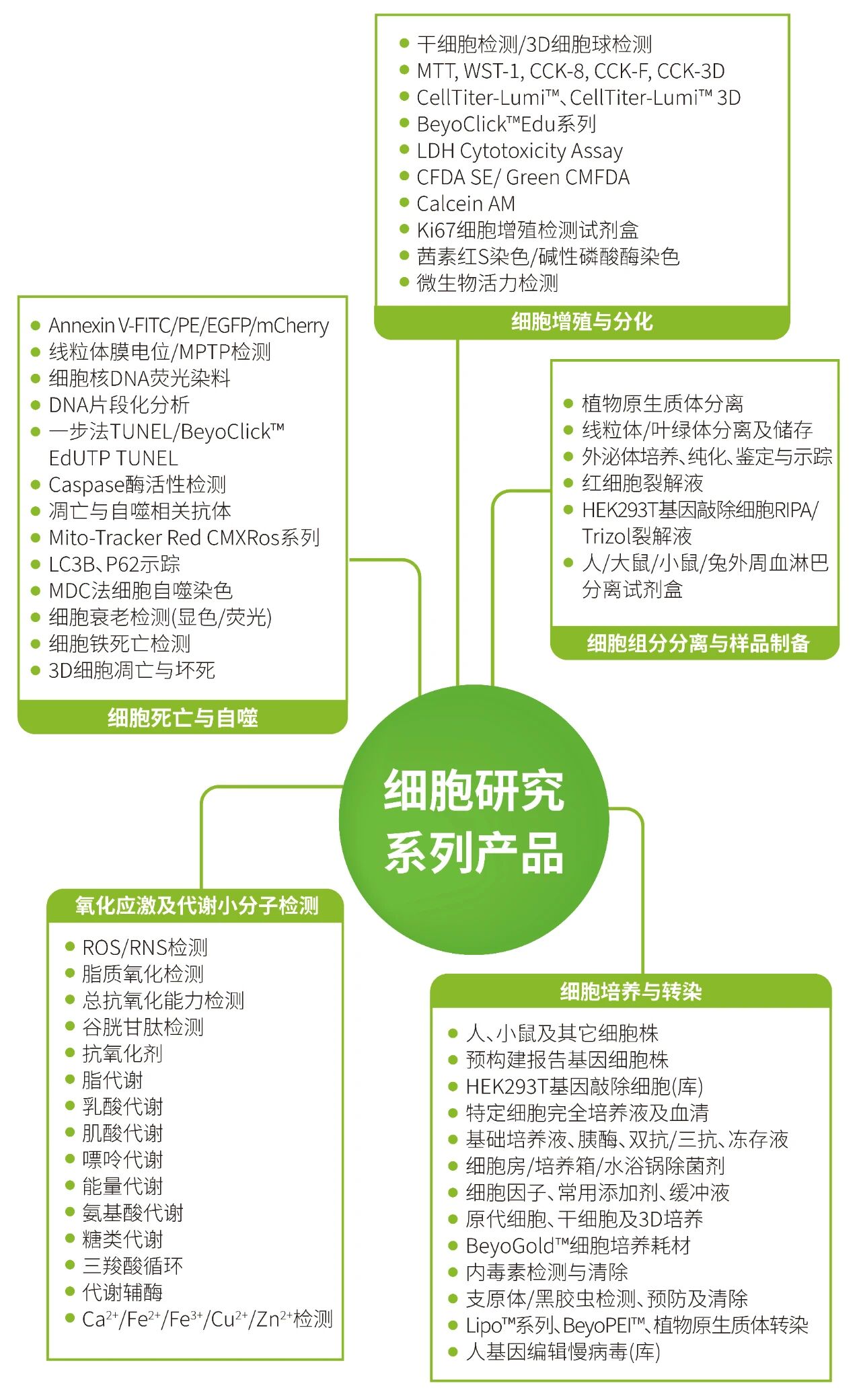 除了BeyoColl™密度梯度分离液在细胞分离与纯化中的出色表现,碧云天在细胞分析与检测领域也构建了全面、系统的产品线,涵盖样本制备、细胞分离、培养优化、检测分析等多个关键环节。为方便您快速了解相关产品及应用方向,我们整理了以下思维导图,助力实验流程更顺畅、研究结果更可靠。