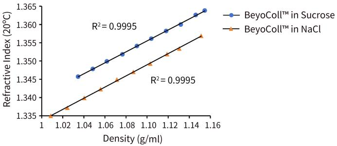 图1. 碧云天BeyoColl™密度梯度分离液(C4546)在蔗糖(0.25M)和NaCl (0.15M)溶液中的折射率与密度之间的相关性(20ºC)。
