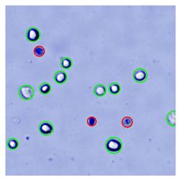 图1.碧云天台盼蓝染色液(2X,细胞计数仪专用)(C1313)用于MCF-7细胞台盼蓝染色的效果图。。