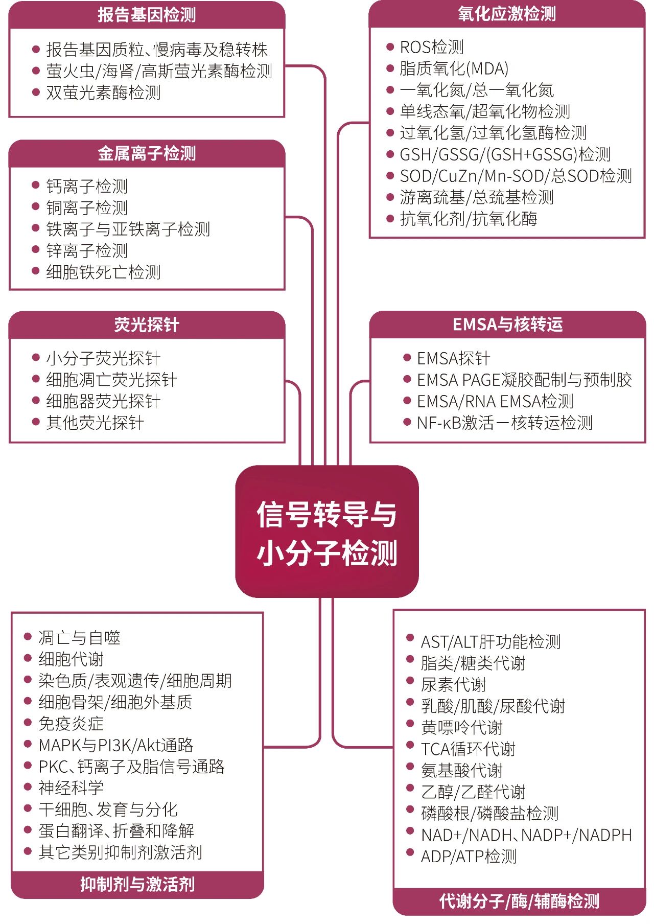 除了本次重点介绍的β-羟基丁酸及其脱氢酶检测试剂盒,碧云天还拥有一系列覆盖糖代谢、三羧酸循环、氨基酸代谢等多个通路的高品质代谢检测产品。为了帮助您更直观、全面地了解这些代谢小分子的检测工具,我们特别整理了以下思维导图,供您参考选用。