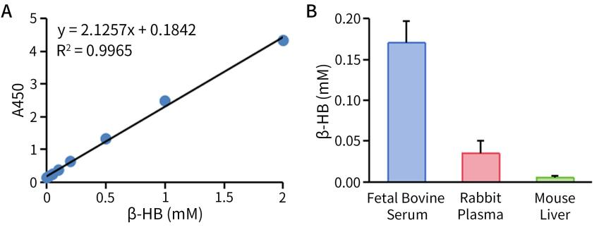 图1.碧云天β-羟基丁酸检测试剂盒(WST-8法)(S0597)对β-羟基丁酸标准品和胎牛血清、兔血浆和小鼠肝脏裂解样品的检测效果图。图A为本试剂盒对β-羟基丁酸标准品的检测效果图,图B为本试剂盒对胎牛血清、兔血浆和小鼠肝脏裂解样品的检测效果图。