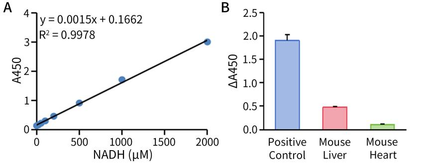图2.碧云天β-羟基丁酸脱氢酶活性检测试剂盒(WST-8法)(P2771)对NADH标准品和阳性对照、小鼠肝脏裂解样品和小鼠心脏裂解液样品的检测效果图。图A为本试剂盒对NADH标准品的检测效果图,图B为本试剂盒检测阳性对照、小鼠肝脏裂解样品和小鼠心脏裂解液样品在反应30分钟后的检测效果图。