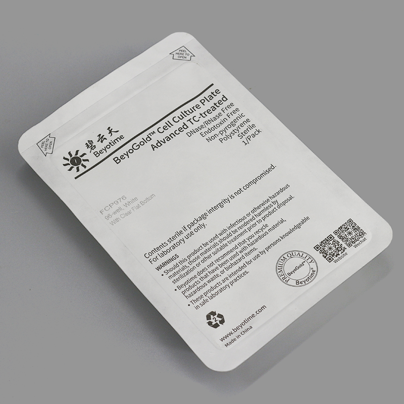 2. 本系列BeyoGold™ TC增强型细胞培养皿/板具有超高品质,使用超精密模具及全自动化生产工艺生产。其中,培养板系列产品均为独立吸塑盒包装,培养皿系列产品最小包装为10个/袋(包)。培养皿包装袋易撕口设计,便于使用。