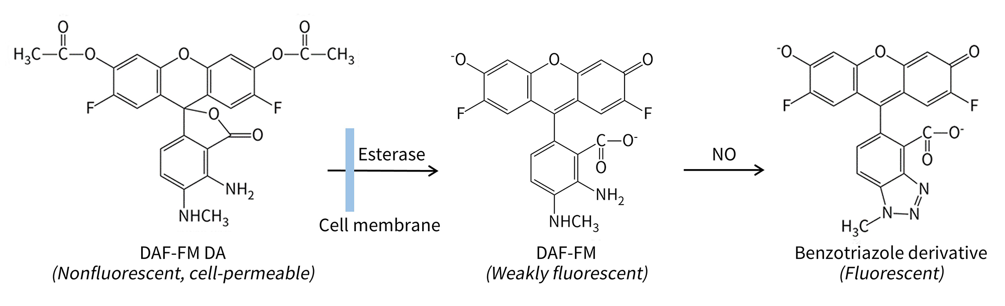 DAF-FM DA,即3-Amino,4 aminomethyl 2',7'-difluorescein, diacetate,也称DAF-FM diacetate或4-Amino,5 aminomethyl-2',7'-difluorescein, diacetate。DAF-FM DA是新一代用于一氧化氮定量检测的荧光探针,比以前比较常用的一氧化氮荧光检测探针DAF-2 diacetate有多方面的改进。首先,DAF-FM DA和DAF-2 diacetate相比,最后和一氧化氮反应形成的荧光产物受pH值的影响小,在pH值大于5.5时不受pH值的影响。其次,DAF-FM DA和DAF-2 diacetate相比,前者产生的荧光更加稳定,不容易淬灭,这样更加便于检测。另外,DAF-FM DA和DAF-2 diacetate相比,前者对一氧化氮的检测灵敏度更高,相同条件下检测灵敏度可以提高接近2倍,最低检测浓度可以达到3nM [4,5]。