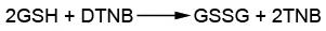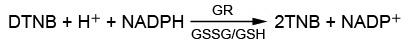 谷胱甘肽还原酶可以还原氧化型谷胱甘肽(GSSG)生成还原型谷胱甘肽(GSH),而GSH可以和生色底物DTNB反应产生黄色的TNB和GSSG,并可以通过测定A412来检测TNB的生成量。适当设置应体系,前后两个反应合并起来后,GSSG/GSH过量而GR相对不足时,该反应体系中谷胱甘肽还原酶就成为整个反应体系的限速因素,此时黄色的TNB生成量和谷胱甘肽还原酶的活性呈线性正相关。从而通过测定A412就可以计算出谷胱甘肽还原酶的活性水平。本试剂盒的具体反应原理如下: