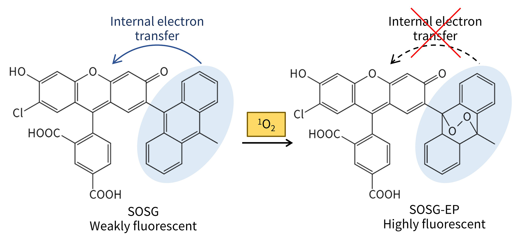 图1.碧云天单线态氧检测试剂盒(SOSG) (S0068)中SOSG的化学结构及与单线态氧(1O2)的反应原理图。SOSG在与单线态氧反应之前,因为存在内部电子转移(Internal electron transfer)会导致荧光淬灭。当SOSG与单线态氧反应后,形成SOSG endoperoxide (SOSG-EP),内部电子转移被阻止,此时能观察到明亮的绿色荧光。注:此处结构式仅供参考。