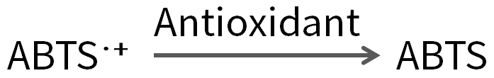 ABTS法测定总抗氧化能力的原理参考图1,ABTS在适当的氧化剂作用下氧化成绿色的ABTS˙+,在抗氧化物存在时ABTS˙+的产生会被抑制,在414nm或734nm测定ABTS˙+的吸光度即可测定并计算出样品的总抗氧化能力。Trolox是一种维生素E的类似物,具有和维生素E相近的抗氧化能力,用作其它抗氧化物总抗氧化能力的参考。例如,Trolox的总抗氧化能力为1,相同浓度情况下,其它物质的抗氧化能力用其抗氧化能力和Trolox相比的倍数来表示。