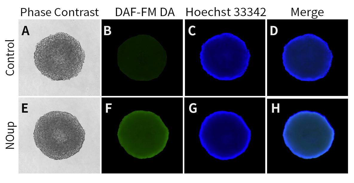 本试剂盒使用便捷,整个检测过程仅需约20分钟即可完成。3D细胞球经一氧化氮阳性对照试剂Beyo3D™ NOup等诱导处理后,将本试剂盒中的Beyo3D™ DAF-FM DA (1000X)按照相应比例用Beyo3D™ DAF-FM DA Assay Buffer配制成Beyo3D™ DAF-FM DA检测工作液,避光孵育20分钟,就可进行后续的荧光显微镜拍照等荧光检测和分析。